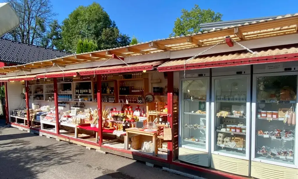 Unser Hofladen fällt nicht nur durch seine schwendenrote Farbe auf, sondern auch die die Auswahl der Produkte.